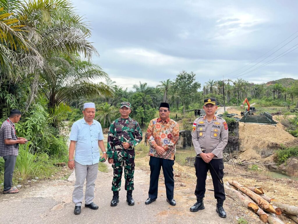 Bupati Aceh Singkil, Safriadi Oyon, Dandim 0109/Aceh Singkil M. Aminudin, serta Kapolres Aceh Singkil Joko Triyono, Tinjau Pemasangan Jembatan Bailey, di Desa Lae Sipola, Kecamatan Singkohor, Selasa (17/2/2026).(Foto: FB/Zulkarnain Gaes)